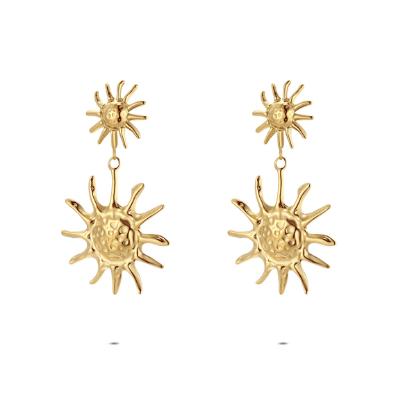 Oorbellen in edelstaal, zonvorm met een hangende schijf.