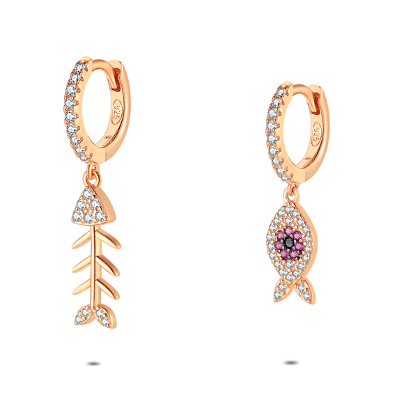 Oorbellen in rosé zilver, oorring met witte zirkonia, vis en graat met witte, fuchsia en zwart zirkonia.